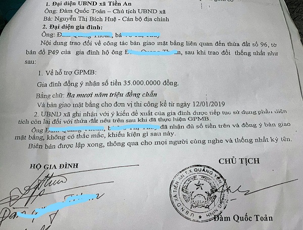 Phó chủ tịch UBND xã cho biết thêm, tháng 1/2019 nhằm đẩy nhanh tiến độ GPMB, Chủ tịch UBND xã Đàm Quốc Toản đã có quyết định ký duyệt phương án bồi thường, hỗ trợ cho 3 hộ dân, trong đó có hộ thậm chí còn được tái định cư tại chỗ. Câu hỏi đặt ra là tại sao chỉ có 3 hộ được bồi thường trong khi tất cả các hộ trong diện di dời đều có nguồn gốc đất như nhau?