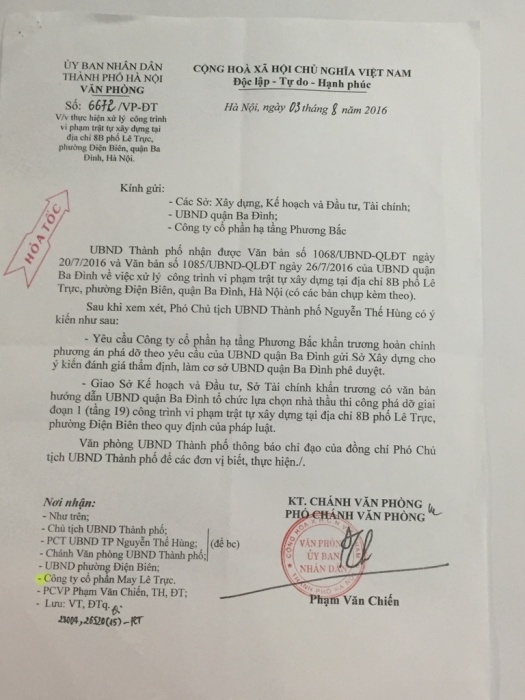 Vậy từ ngày 6/3/2016 đến nay UBND phường Điện Biên đã và đang "làm" gì đối với công trình? Đặc biệt chỉ qua 1 đêm, tức sáng ngày 4/8/2016, các lực lượng chức năng của quận Ba Đình tiếp tục tổ chức cưỡng chế, phá khoá nhà 8B Lê Trực? Việc làm này là vi phạm pháp luật!