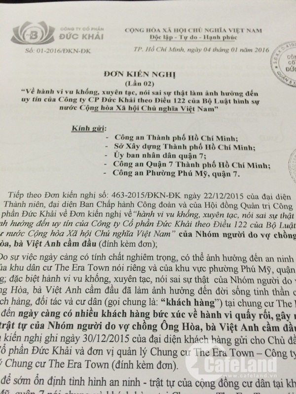 Đơn Công ty Đức Khải gửi cơ quan chức năng "tố" nhóm cư dân gây rối, làm ảnh hưởng đến uy tií của chủ đầu tư