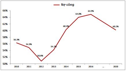 Tỷ lệ nợ công trên GDP đã giảm về 50,8% vào năm 2012, nhưng dự báo tăng lên 60,3% năm 2015 và có thể tiến tới 64,9% trong năm tới - tiệm cận với ngưỡng an toàn 65% GDP. Chính phủ phát đi thông tin sẽ giảm chỉ tiêu này về 60,2% vào năm 2020, nhưng VinaCapital vẫn đặt câu hỏi làm thế nào để nợ công leo lên gần mốc 65% GDP trong năm tới và sau đó có thể giảm về 60,2%.