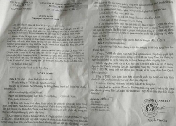 Căn cứ vào các quy định của pháp luật, Thanh tra Sở Xây dựng tỉnh Đắk Lắk đã ra quyết định xử phạt “vi phạm hành chính trong lĩnh vực đầu tư xây dựng” 30 triệu đồng đối với Công ty Nam Sơn. Ngoài ra, Thanh tra Sở Xây dựng tỉnh Đắk Lắk yêu cầu, phía Công ty Nam Sơn dừng thi công, chấm dứt ngay hành vi vi phạm. Trong vòng 60 ngày, kể từ ngày lập biên bản vi phạm hành chính, Công ty Nam Sơn phải làm thủ tục, đề nghị cơ quan có thẩm quyền cấp giấy phép xây dựng theo quy định.