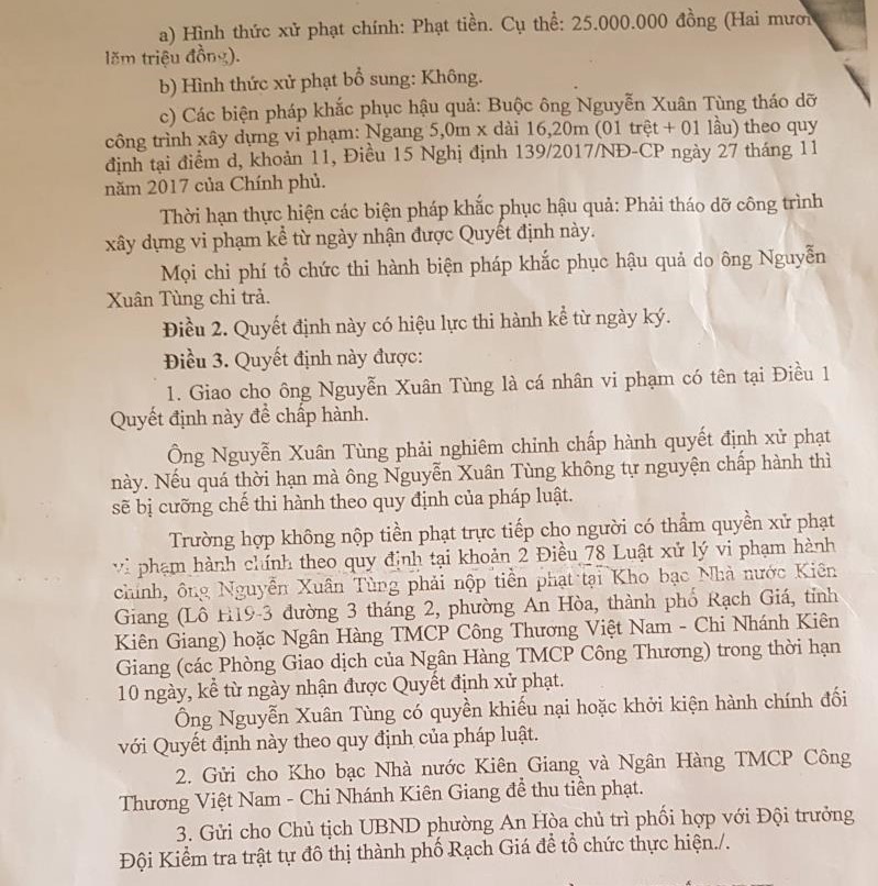 UBND TP Rạch Giá buộc ông Tùng tháo dỡ công trình vi phạm kể từ ngày nhận được quyết định xử phạt. Nếu quá thời hạn mà ông Tùng không chấp hành, cơ quan chức năng sẽ cưỡng chế theo quy định.