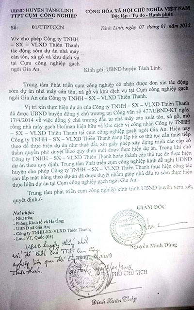 Vì sao một dự án chưa lập thủ tục thuê đất, nằm cách tỉnh lộ 720 vài trăm mét nhưng Công ty Thiên Thanh lại cho khai thác khoáng sản trái phép mà không bị phát hiện, ngăn chặn, xử lý? Qua tìm hiểu, chúng tôi được biết sở dĩ có việc này là nhờ “lá bùa” hậu thuẫn. Cụ thể, đầu tháng 1-2015, Trung tâm Phát triển cụm công nghiệp (thuộc UBND huyện Tánh Linh) có tờ trình gửi UBND huyện nêu Công ty Thiên Thanh đang lập các thủ tục thực hiện dự án. Trong thời gian chờ hoàn thành thủ tục, trung tâm đề xuất UBND huyện cho phép công ty này san lấp mặt bằng sớm. Mặc dù đề xuất theo kiểu “cầm đèn chạy trước ô tô” nhưng ông Đinh Xuân Thủy, Phó Chủ tịch UBND huyện Tánh Linh, đã bút phê đồng ý luôn dưới tờ trình và đóng dấu hẳn hoi.