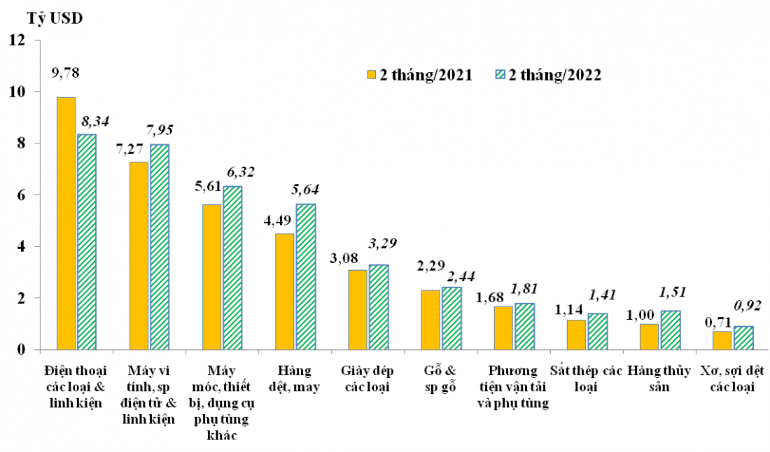 Trị giá xuất khẩu của sắt thép và một số nhóm ngành khác trong 2 tháng/2021 và 2 tháng/2022