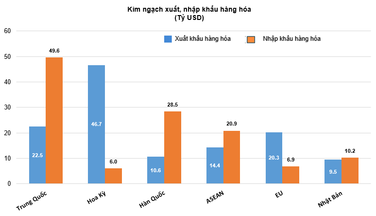 Về thị trường xuất, nhập khẩu hàng hóa 5 tháng đầu năm 2022, Hoa Kỳ là thị trường xuất khẩu lớn nhất của Việt Nam với kim ngạch ước đạt 46,7 tỷ USD. Trung Quốc là thị trường nhập khẩu lớn nhất của Việt Nam với kim ngạch ước đạt 49,6 tỷ USD.