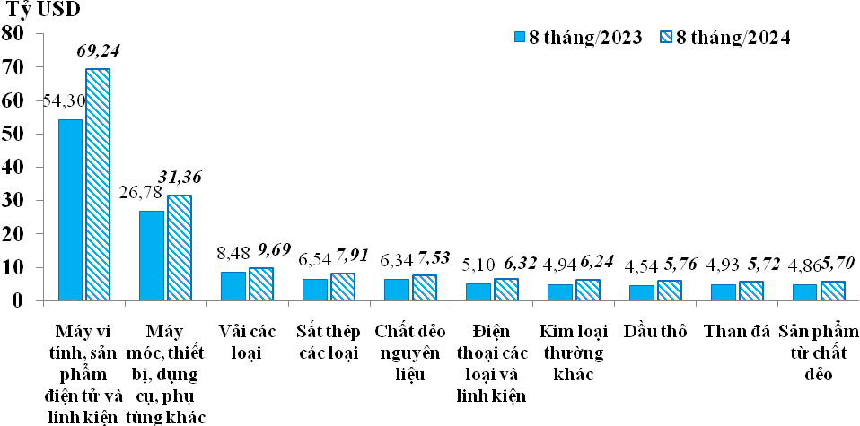 Trong 8 tháng đầu năm 2024, Việt Nam đã ghi nhận 39/53 nhóm hàng đạt trị giá nhập khẩu trên 1 tỷ USD, tăng 1 nhóm so với cùng kỳ năm 2023. Đặc biệt có 2 nhóm hàng nhập khẩu đạt trị giá lớn là máy vi tính, sản phẩm điện tử và linh kiện đạt 69,24 tỷ USD; máy móc, thiết bị, dụng cụ và phụ tùng đạt 31,36 tỷ USD.
