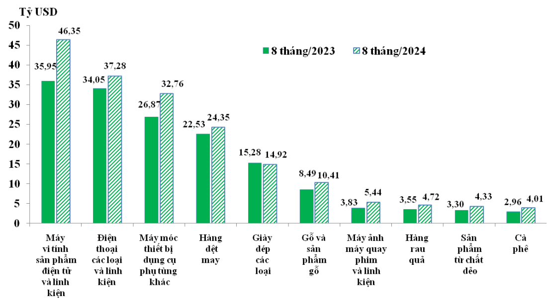 Tổng trị giá xuất khẩu hàng hóa trong 8 tháng/2024 đạt 265,44 tỷ USD, tăng 15,9% so với cùng kỳ năm trước. Trong đó, có 10 nhóm hàng tăng trên 1 tỷ USD so với cùng kỳ năm trước.