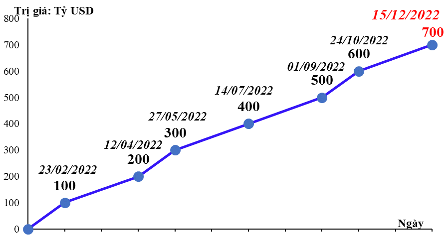 Cột mốc mới 700 tỷ USD sẽ được ghi nhận vào ngày 15/12/2022 (tính đến ngày 14/12/2022, trị giá xuất nhập khẩu là 698,5 tỷ USD).