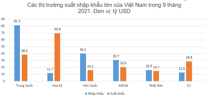 Về thị trường xuất khẩu hàng hóa 9 tháng năm 2021, Hoa Kỳ là thị trường xuất khẩu lớn nhất của Việt Nam với kim ngạch đạt 69,8 tỷ USD, tăng 27,6% so với cùng kỳ năm trước. Tiếp đến là Trung Quốc đạt 38,5 tỷ USD, tăng 18,3%. Thị trường EU đạt 28,8 tỷ USD, tăng 11,6%. Thị trường ASEAN đạt 20,6 tỷ USD, tăng 21,2%. Hàn Quốc đạt 16,1 tỷ USD, tăng 11,4%. Nhật Bản đạt 14,7 tỷ USD, tăng 5,1%.