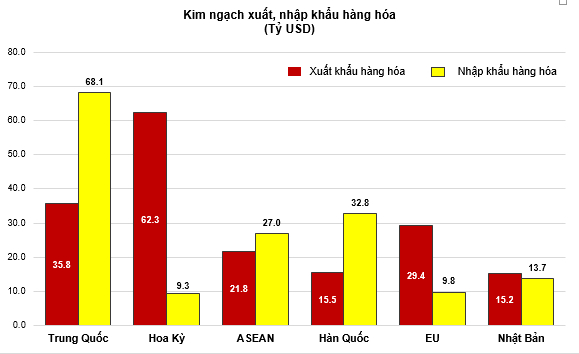 Trong 8 tháng năm 2023, xuất siêu sang Hoa Kỳ ước đạt 53 tỷ USD giảm 21% so với cùng kỳ năm trước; xuất siêu sang EU ước đạt 19,6 tỷ USD, giảm 9,7%; xuất siêu sang Nhật Bản 1,5 tỷ USD (cùng kỳ năm trước nhập siêu 146 triệu USD); nhập siêu từ Trung Quốc 32,3 tỷ USD, giảm 30,2%; nhập siêu từ Hàn Quốc 17,3 tỷ USD, giảm 34,5%; nhập siêu từ ASEAN 5,2 tỷ USD, giảm 38,4%.