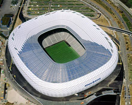 Được tạo nên từ 2874 tấm nhựa ETFE, SVĐ Allianz Arena có hình dáng mềm mại, giống như một đám mây khổng lồ. Đây là niềm tự hào to lớn của người dân thành phố Munich, chính thức là SVĐ bóng đá lớn nhất tại Đức và trên thế giới. Bao quanh SVĐ là hàng trăm tấm panô có khả năng thay đổi màu sắc. Thiết kế đặc biệt này mang đến cho Allianz Arena trở thành SVĐ đầu tiên trên thế giới có thể thay đổi toàn bộ màu sắc bên ngoài. “Chú tắc kè hoa” này mang màu đỏ khi đội Bayern Munich thi đấu, mang màu xanh khi đội 1860 Munich thi đấu và màu trắng khi đội tuyển Quốc gia Đức thi đấu.