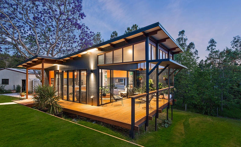 Mẫu nhà lắp ghép với mái hiên nghiêng đang được ưa chuộng ở các vùng quê có phong cảnh thiên nhiên hữu tình. Mang đến một vẻ đẹp nhẹ nhàng, ấm áp, ngôi nhà như một nơi nghỉ dưỡng của gia đình.