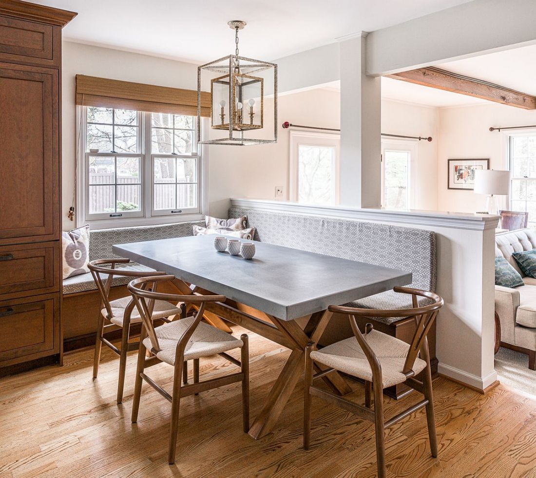 Nếu nhà bạn bị hạn chế về mặt diện tích thì hãy nghĩ đến các thiết kế nhỏ về không gian ăn uống, bàn ăn hình tròn luôn tiết kiệm diện tích so với những mẫu hình vuông, hình chữ nhật và một chiếc có bệ ngồi cũng giúp bạn kê những chiếc ghế đó vào.