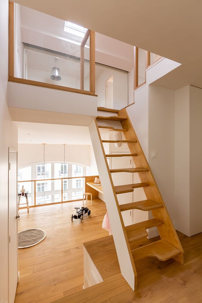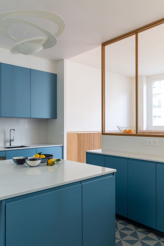 Gỗ sồi được kết hợp cùng gam màu xanh lam nhạt mang lại nét đặc trưng cho ngôi nhà. Mối liên kết này vừa tạo sự hài hòa giữa các chất liệu vừa giữ được bản sắc của ngôi nhà ấm áp và hiện đại giữa trung tâm Paris.