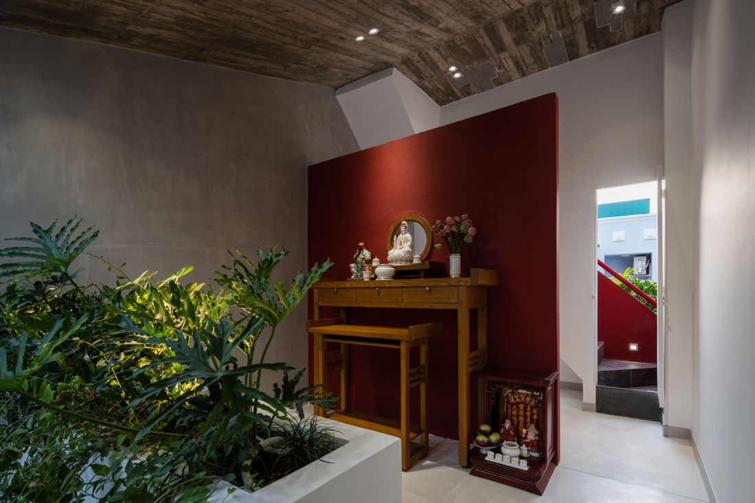 Không gian thờ phụng được bố trí ở trên cùng hướng ra khoảng giếng trời lớn. Kiến trúc sư hy vọng sẽ truyền tải văn hóa tín ngưỡng ở góc nhìn nhẹ nhàng và gần gũi hơn.