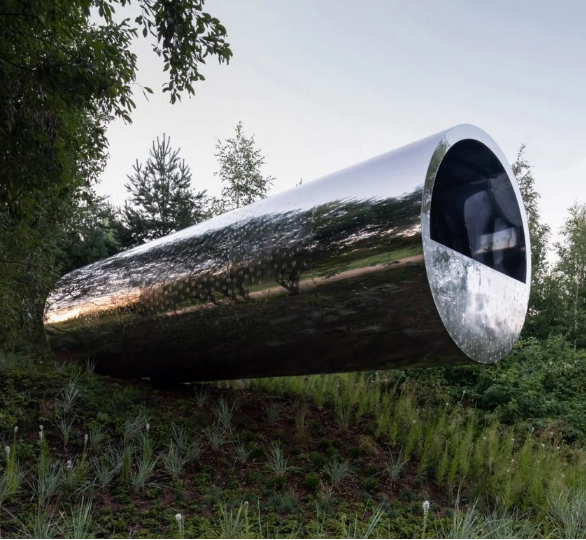 Đây là nhà nghỉ mát hình ống bắc qua một ngọn đồi trong công viên nghệ thuật Nikola-Lenivets của Nga. Kiến trúc sư đã bọc tòa nhà dài 12m này bằng một tấm thép không gỉ và chúng được liên kết với với nhau bằng sáu bu lông.