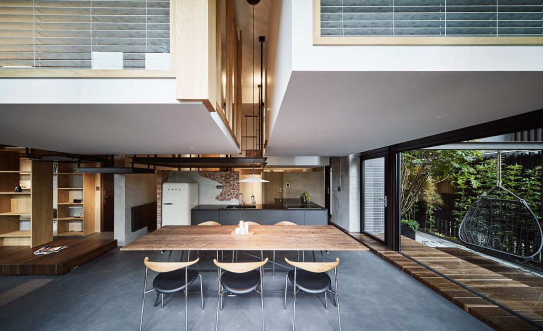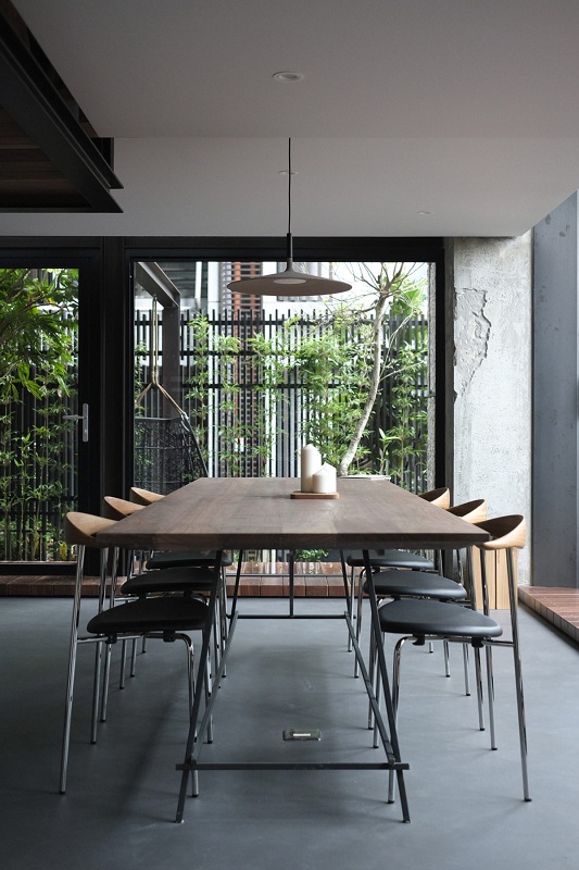 Một khe hở được tạo ra ở giữa 2 phòng ngủ treo 2 bên, phía dưới bàn ăn hình chữ nhật. Sự phân chia hợp lý ấy để lại một khoảng trống hoàn hảo cho chiếc đèn treo phòng ăn.