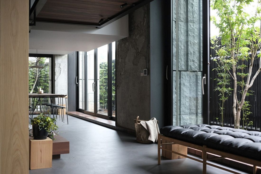 Cửa kính lớn cùng nhiều cây xanh giúp không gian thoáng rộng, hòa mình vào cuộc sống, hơi thở của thiên nhiên.