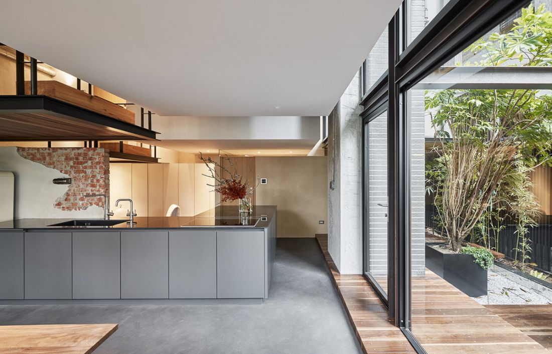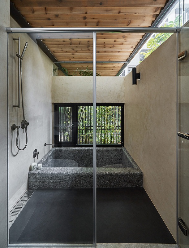 Mái hở mang thêm ánh sáng vào phòng tắm để bổ sung cho cửa sổ thấp bên dưới với phòng tắm chìm độc đáo.
