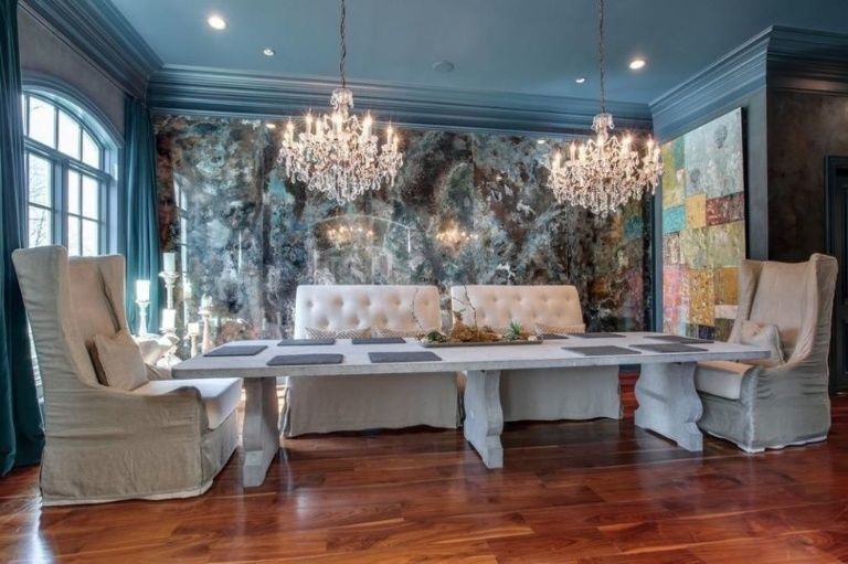 Bức tường ấn tượng cùng đèn chùm trang trí độc đáo tạo nên giá trị của ngôi nhà.