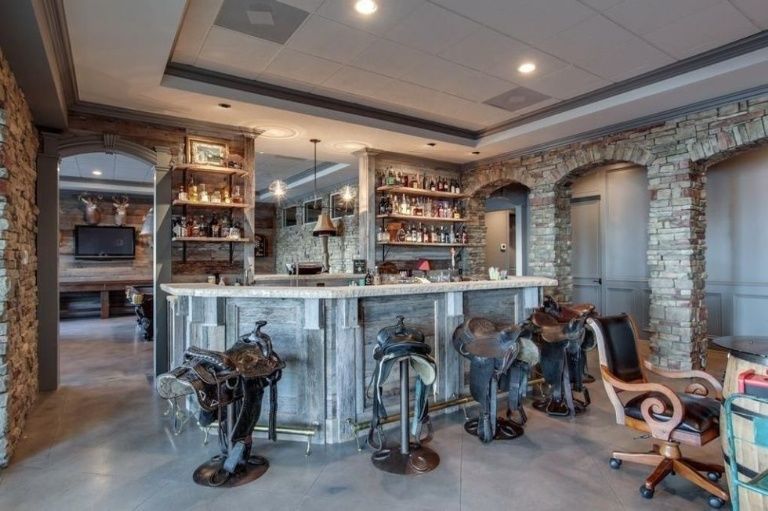 Khu vực quầy bar được bài trí theo phong cách cowboy vùng Texas với ghế cách điệu từ yên cương, kệ rượu.