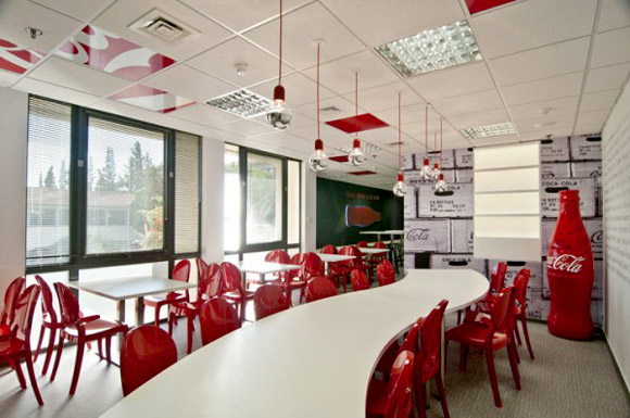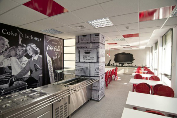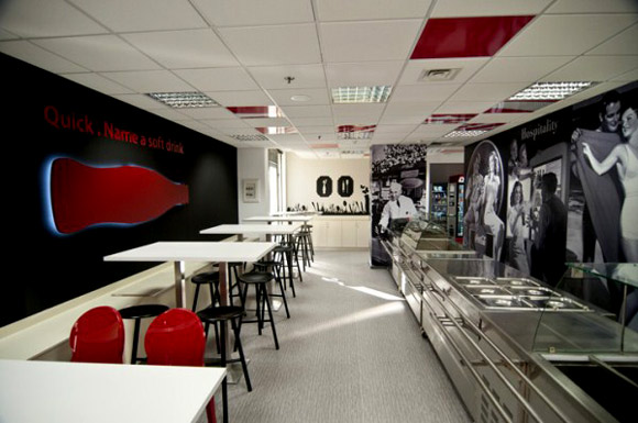 Do tính chất quan trong của khu vực ăn uống chung, vừa là nơi gặp gỡ, trò chuyện, thư giãn... nên thiết kế cũng thật thoáng đãng và thoải mái, nêu bật tinh thần sáng tạo, đột phá mà Coca Cola muốn hướng tới cho nhân viên của mình. Khá nhiều logo, biểu tượng cũng như các mẩu quảng cáo của Coca Cola, tuy nhiên lại không hề tạo cảm giác ngột ngạt. |