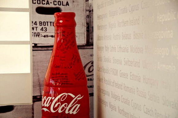 Mô hình chai Coca Cola đặt trong một góc của khu vực ăn uống này. |