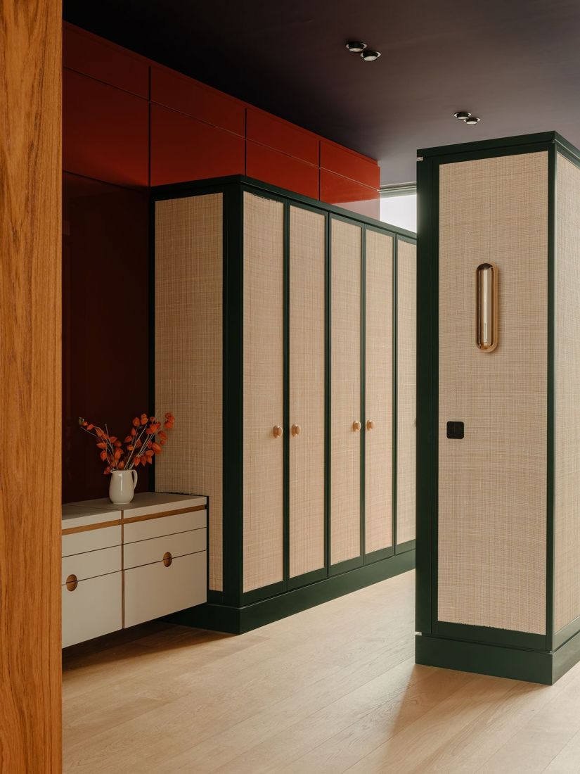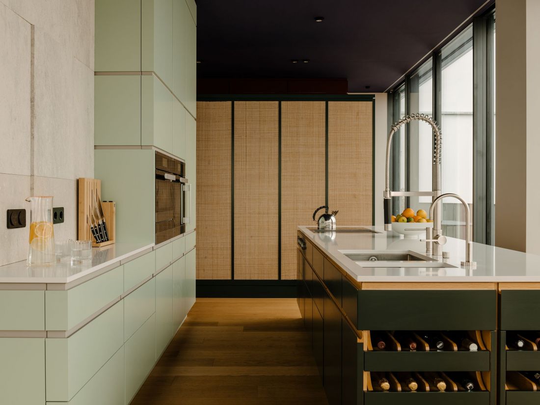 Không gian được hoàn thiện với màu xanh ô liu và tủ màu bạc hà, cả hai được thiết kế riêng phù hợp với lựa chọn vật dụng nhà bếp của gia chủ.