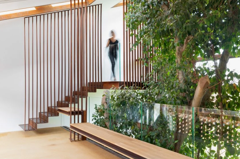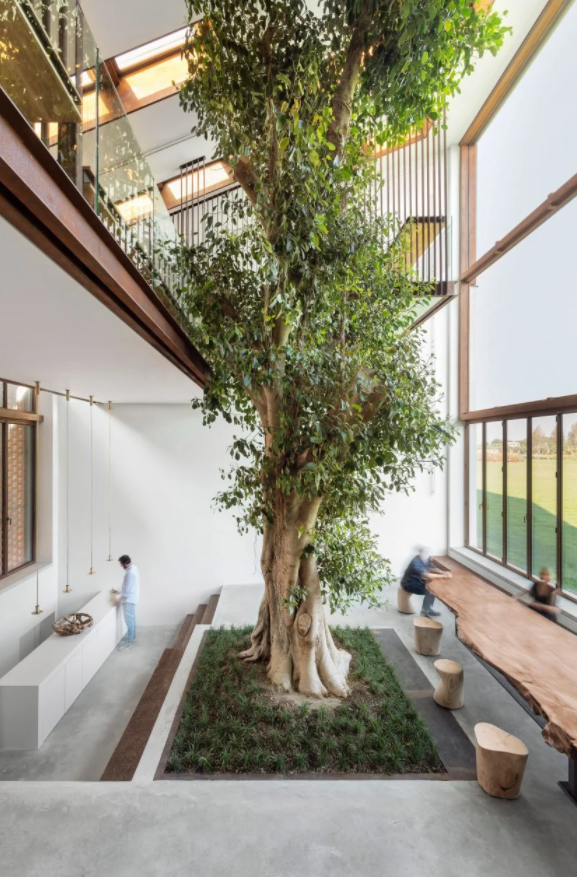 Để bảo vệ cây sung lâu năm phát triển tốt, kiến trúc sư đã cho xây dựng một bức tường cao 10m tại hướng Nam có tác dụng tối đa ánh sáng tự nhiên đồng thời tạo nên sự thoải mái hơn cho không gian sống bên trong.