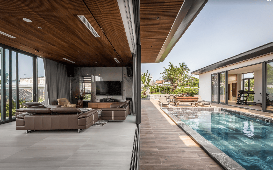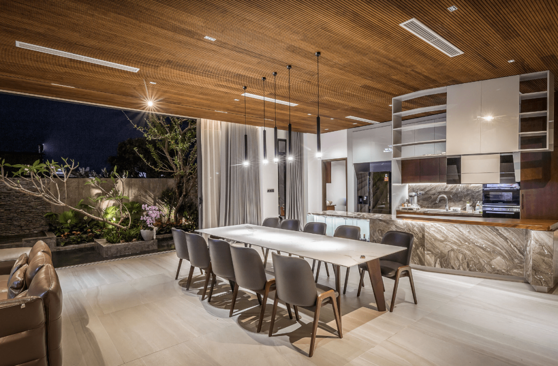 Tại tầng trệt của biệt thự, hệ cửa kính lùa giúp mở rộng toàn cảnh không gian với 3 khu vực chức năng riêng biệt bao quanh hồ bơi. Khu vực thứ nhất gồm phòng khách mở, phòng ăn, bếp và phòng của ông bà ở phía sau nhằm đảm bảo sự riêng tư.