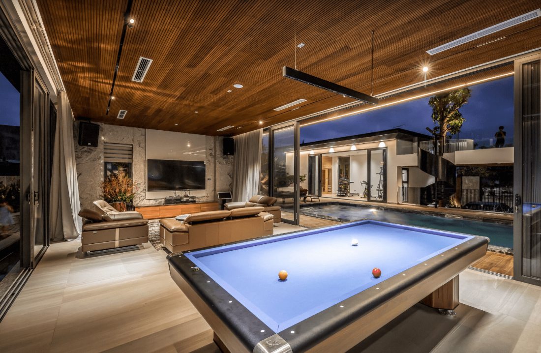 Khu vực kế tiếp là không gian giải trí gồm có quầy bar, bàn bida và sofa.