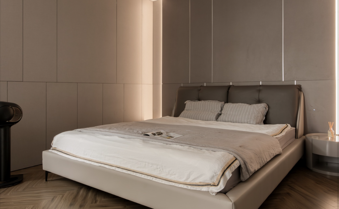 Phòng Ngủ Master: Mang vẻ đẹp hiện đại, lãng mạn với giường trắng xám và sàn gỗ xương cá nâu xám – một sự kết hợp cổ điển tinh tế. Ánh đèn LED pha dịu nhẹ cùng chiếc tủ đầu giường trắng nhỏ xinh hoàn thiện một không gian nghỉ ngơi đậm chất thơ, gần gũi và thư thái.