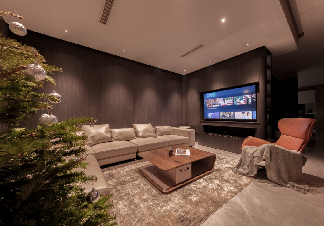 Vách ngăn đa năng: Sự phân định giữa phòng khách và khu vực ăn uống được thực hiện khéo léo bằng vách ngăn tường gỗ tích hợp kệ TV. Đây là giải pháp thông minh, vừa đảm bảo sự riêng tư thị giác, vừa giữ được sự kết nối linh hoạt giữa các khu vực.