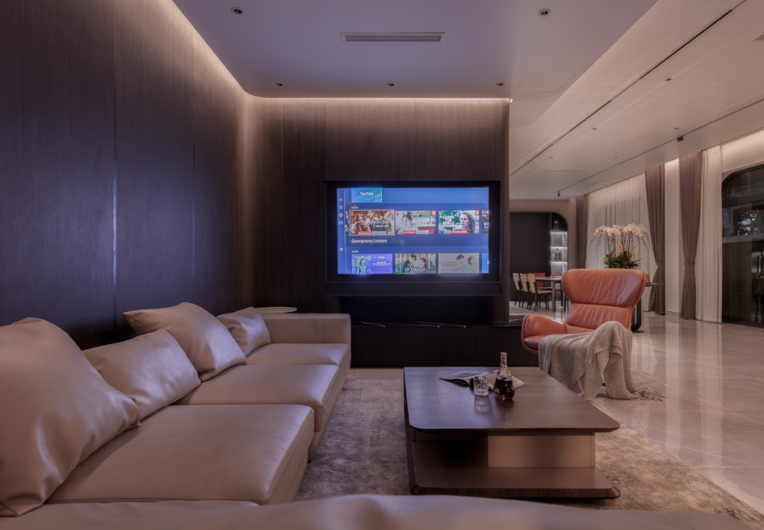 Phòng khách được phân định với bếp và khu vực ăn uống bởi vách ngăn tường gỗ đa năng khiêm kệ ti vi, sofa trắng big size.