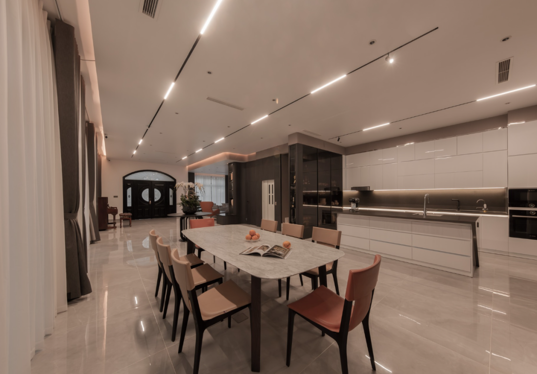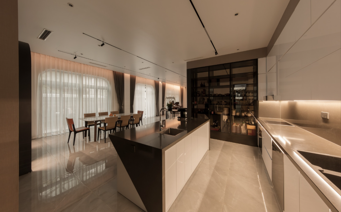 Không gian bếp và ăn uống được ưu ái với diện tích rộng rãi, tạo điều kiện cho những bữa cơm gia đình quây quần. Tông màu đối lập sang trọng. Hệ tủ bếp sử dụng tông trắng hiện đại, kết hợp với đảo bếp phá cách được ốp đá đen đối lập. Sự tương phản này tạo nên một không gian nhẹ nhàng nhưng không kém phần ấm áp và ấn tượng, thể hiện rõ gu thẩm mỹ cá nhân của gia chủ.