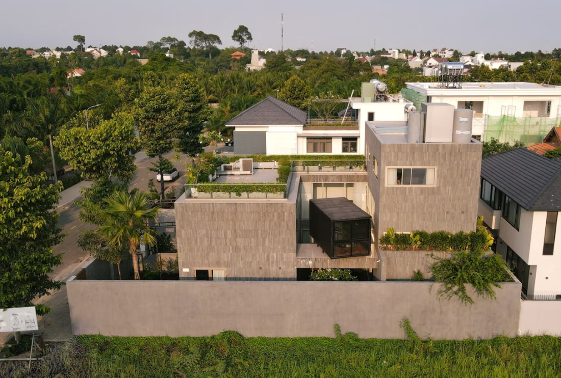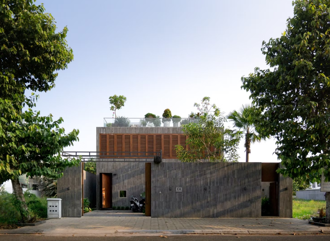 Hình dáng của biệt thự được lấy cảm hứng từ bố cục của các khối hình hộp chữ nhật đơn giản. Sự độc đáo nằm ở cách xử lý mặt tiền và vật liệu như: hệ lam kéo dài: Điểm nhấn nổi bật trên mặt tiền là hệ thống khung lam cửa sổ dài. Chi tiết này không chỉ gợi nhớ đến kiến trúc truyền thống vùng nhiệt đới mà còn giúp tăng cường đối lưu gió, giữ cho không gian nội thất luôn thông thoáng và mát mẻ.