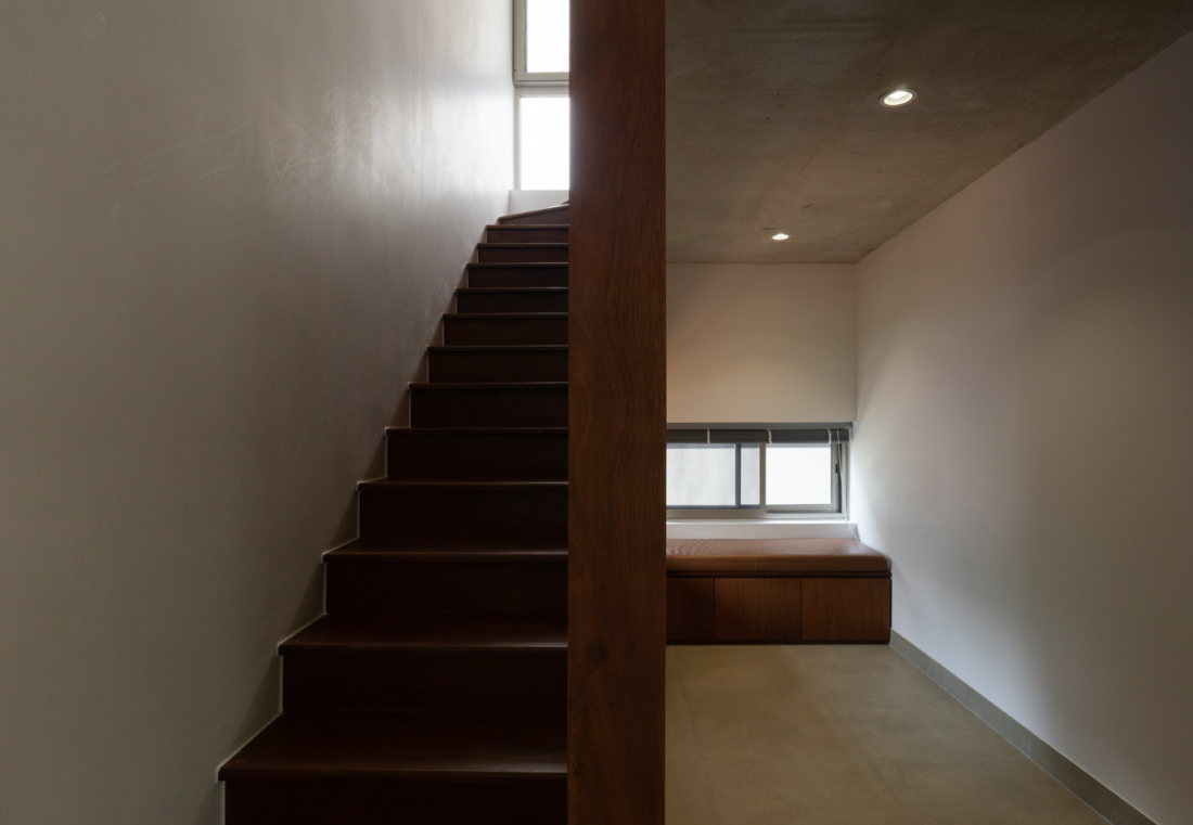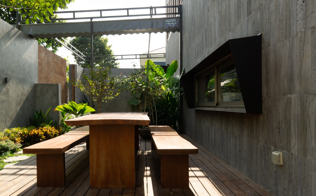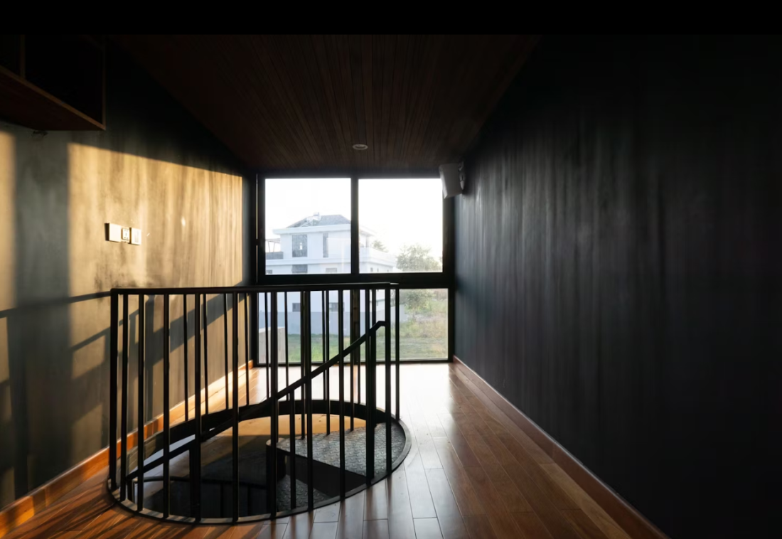 Nội thất bên trong sử dụng bê tông trần (raw concrete) và gỗ tự nhiên, giúp không gian có cảm giác gần gũi, thân thiện, và chân thật.