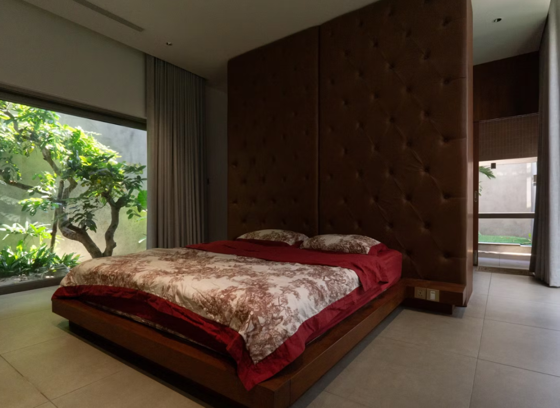 Phòng ngủ Master bố trí tại tầng trệt, sàn bê tông, tab đầu giường vừa đảm công năng vách ngăn.