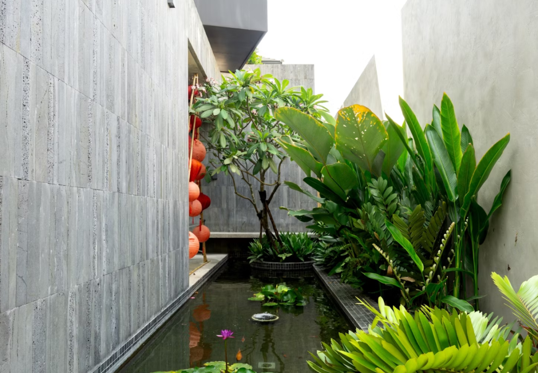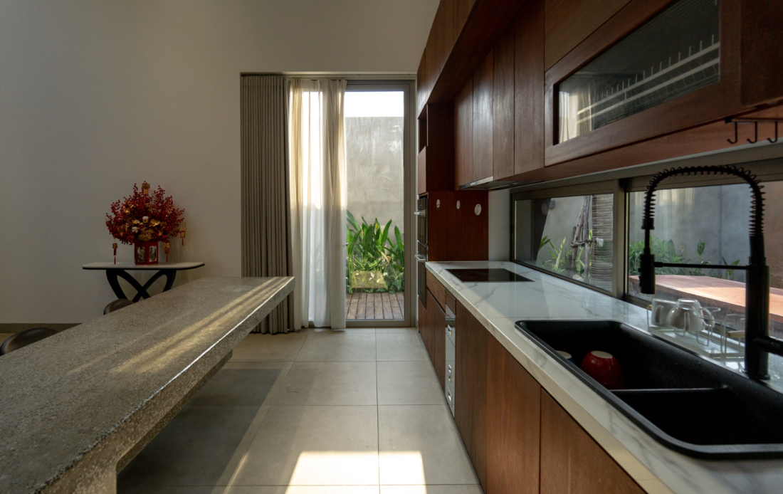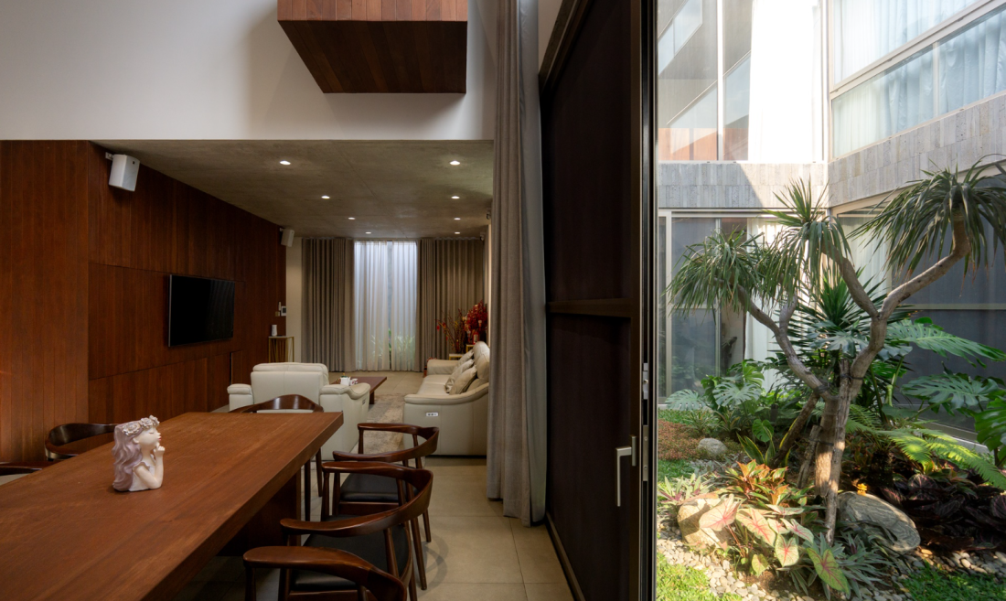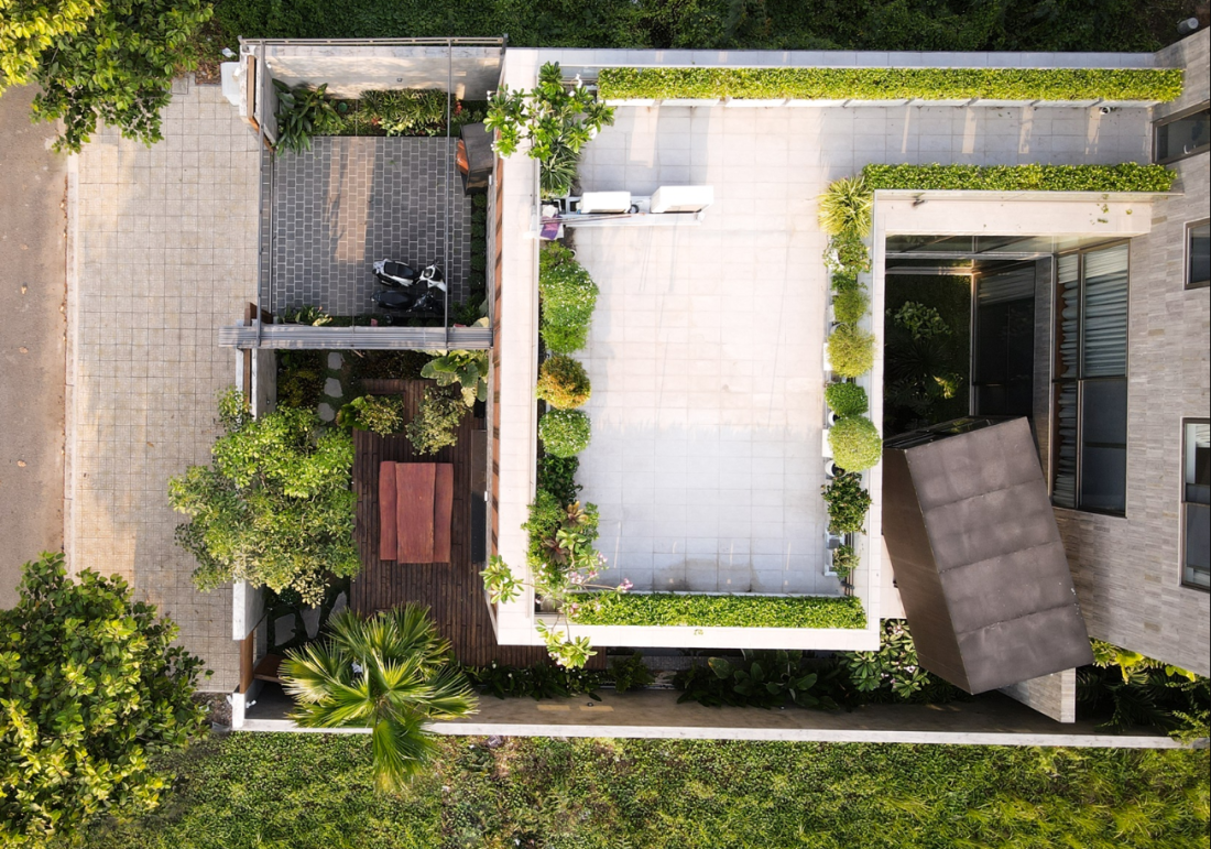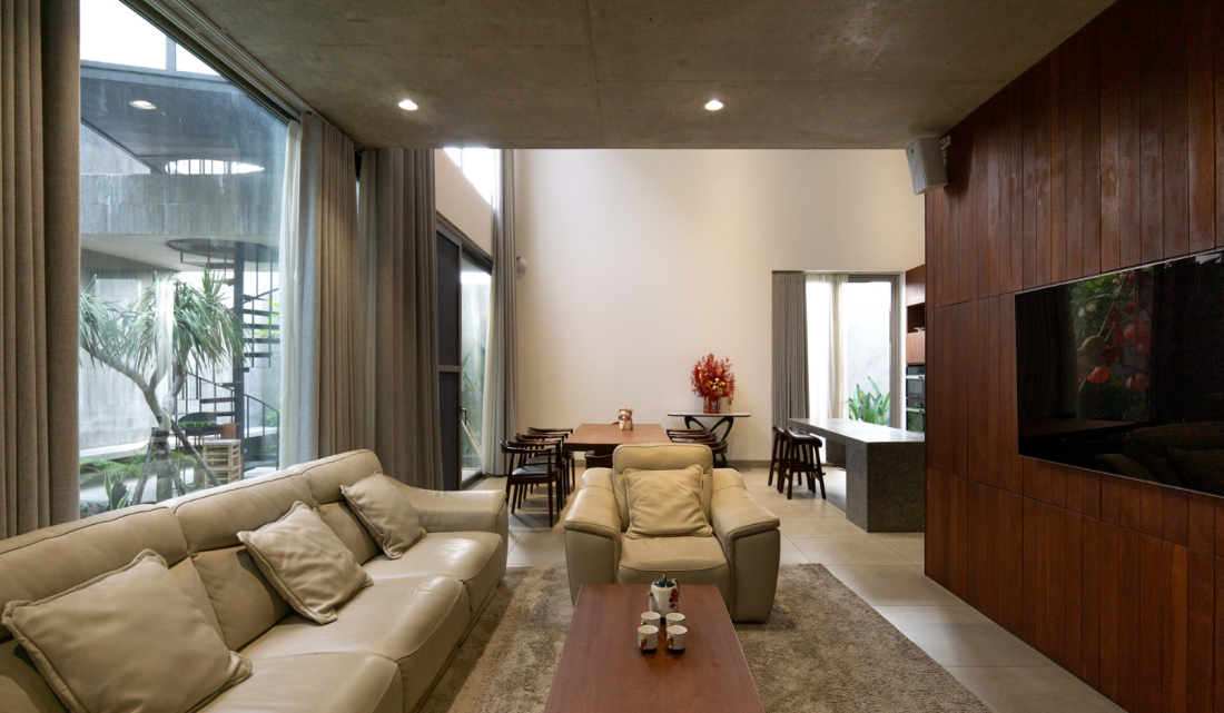 Chủ nhân mong muốn xây dựng một không gian sống không chỉ đẹp mà còn phải mang lại chất lượng sống tốt nhất cho các thành viên, nơi mọi người đều có sự riêng tư nhưng luôn được kết nối. Để hiện thực hóa khát vọng này, kiến trúc sư đã đề xuất một giải pháp kiến trúc hiện đại nhưng vẫn mang hơi thở của phong cách Á Đông nhiệt đới. Việc dành gần 60% diện tích cho thiên nhiên giúp mọi không gian trong nhà đều được mở tối đa, dễ dàng kết nối với cảnh quan xanh mát bên ngoài.