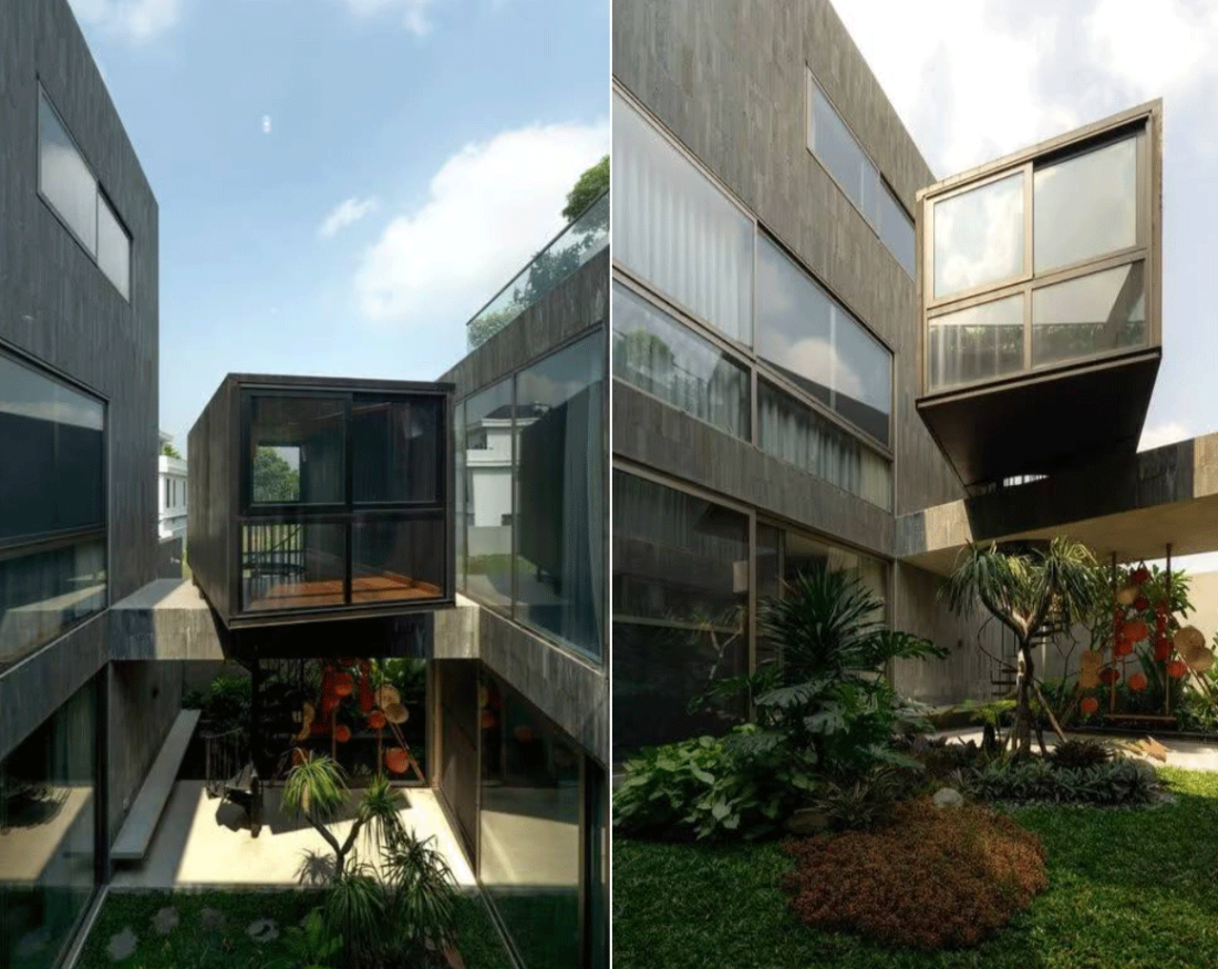 Điểm nhấn sáng tạo: Khối container đa năng. Kiến trúc sư đã tạo ra một điểm nhấn thị giác và công năng đột phá trên tầng 2: khu đọc sách & yoga độc lập: Khu vực đọc sách và tập yoga được bố trí trong một khối hình hộp, đặt lệch góc so với tổng thể công trình. Sự sắp đặt lệch góc này tạo nên cái nhìn độc đáo và năng động cho biệt thự, đồng thời đảm bảo không gian thiền tịnh này có sự riêng tư cần thiết.