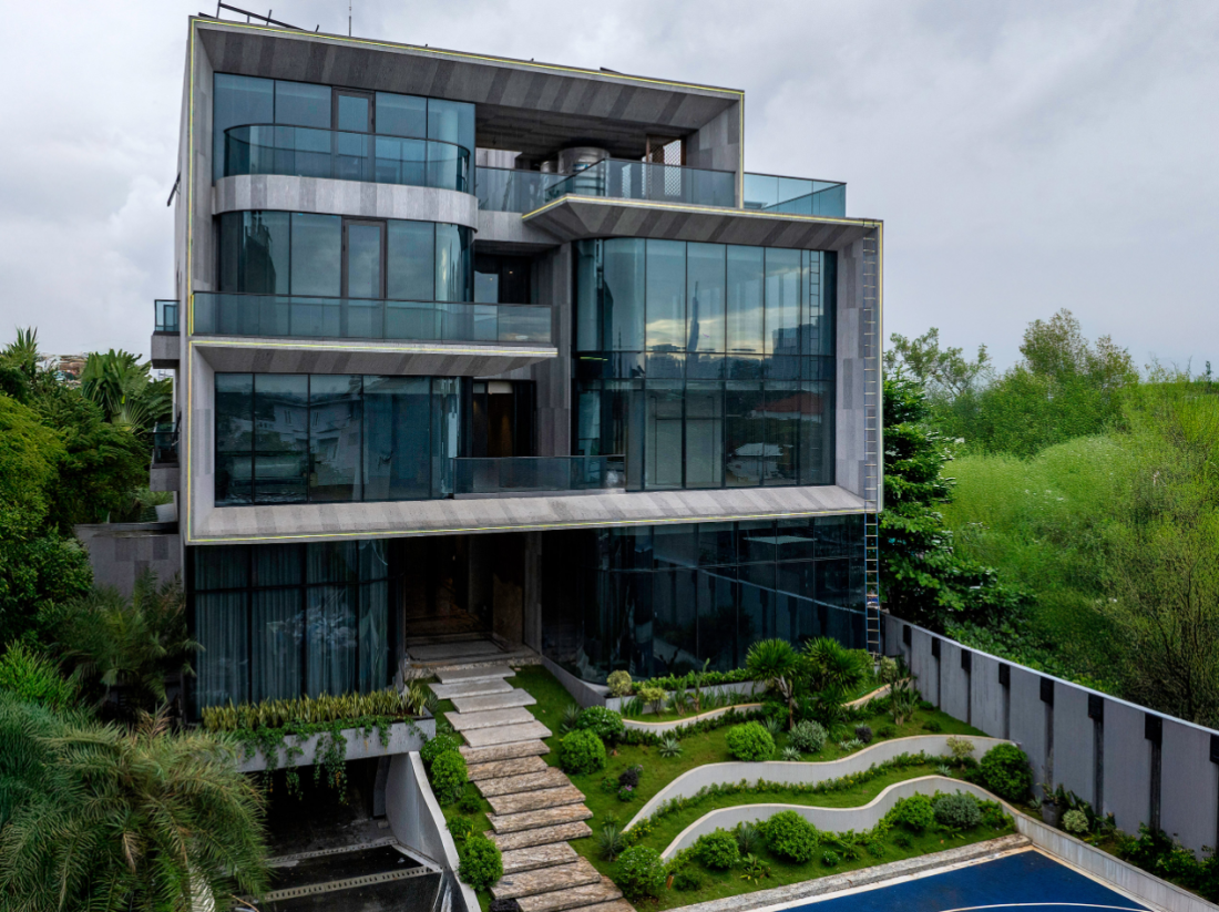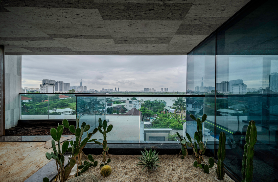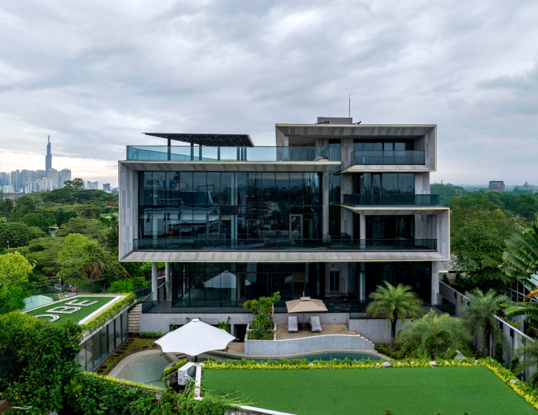 Biệt thự bị cuốn hút bởi mặt tiền, đó là một khối bê tông lớn, được cắt gọt, xoay chuyển theo ba chiều không gian, tạo nên lớp lớp chiều sâu đầy ấn tượng. Những khối bê tông này không chỉ là vỏ bọc bảo vệ mà còn là yếu tố chính tạo hình, kết hợp với kính Low-E trong suốt để mở rộng tầm nhìn ra thiên nhiên.