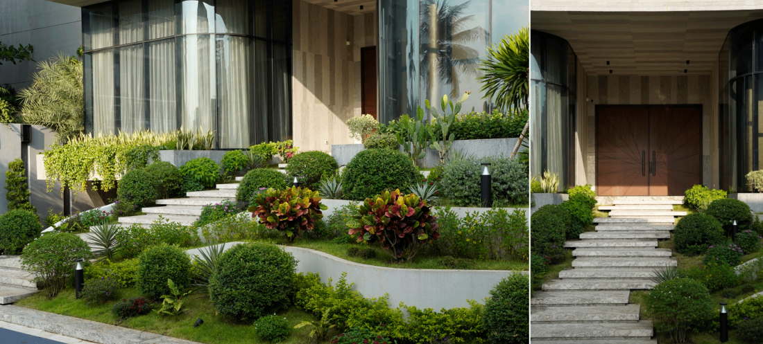 Hành lang, cầu thang bậc cấp được thiết kế hài hòa với đường uốn lượn tạo nên cảnh quan mềm mại trước khối kiến trúc vững chắc