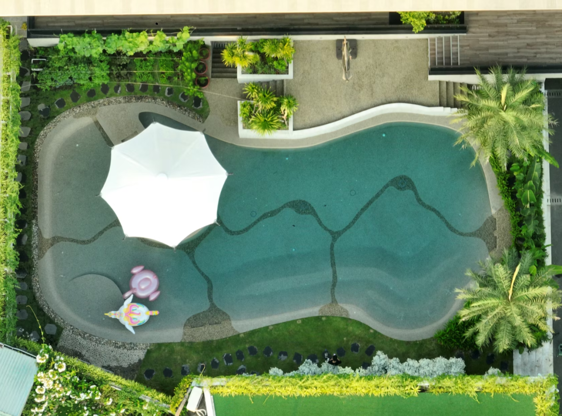 Ra ngoài sân sau là balcony dài 29m hướng ra hồ bơi, một nơi thư giãn với phong cách sinh thái. Nước hồ trong xanh, xung quanh là cây xanh và ghế ngồi thoải mái. Đây là nơi thư giãn lý tưởng sau một ngày dài, với gió mát từ sông thổi vào.