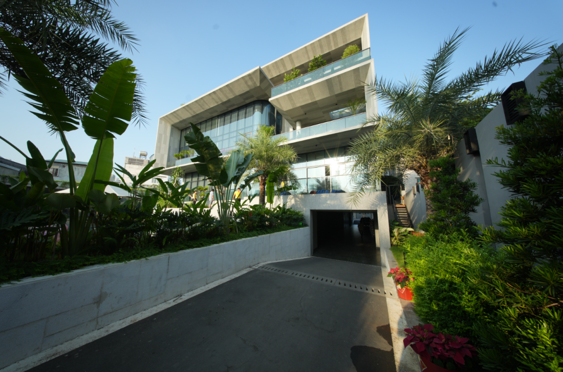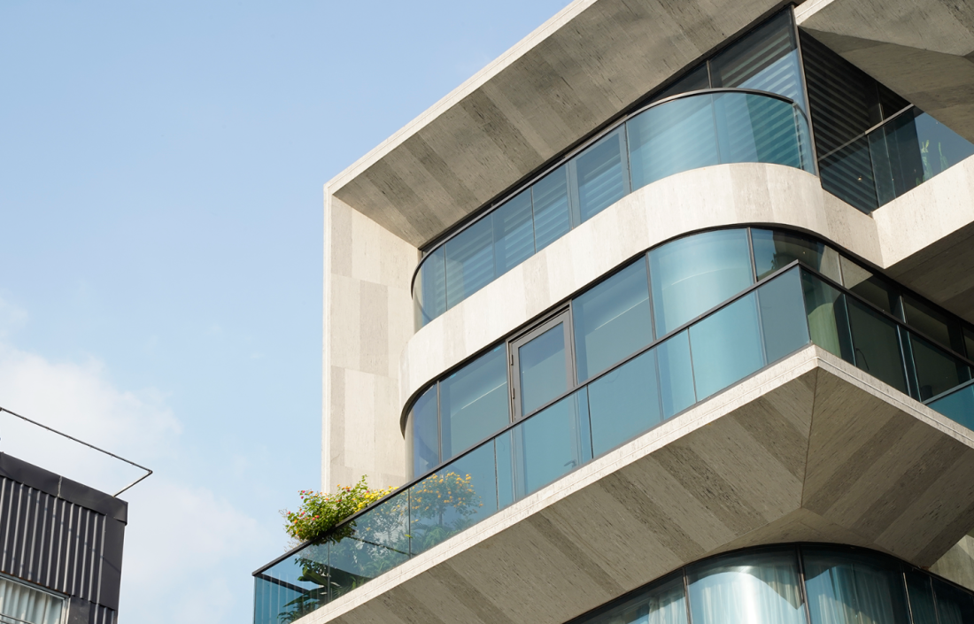 Sự tương phản giữa bê tông cứng cáp và kính trong vắt mang lại cảm giác mạnh mẽ nhưng vẫn gần gũi, như một bức tranh hiện đại đang sống dậy. Mặt tiền được phủ lớp sơn hiệu ứng bê tông với gradient nhẹ, làm mềm mại những bề mặt vững chãi, tránh cảm giác đơn điệu thường thấy ở các công trình bê tông.