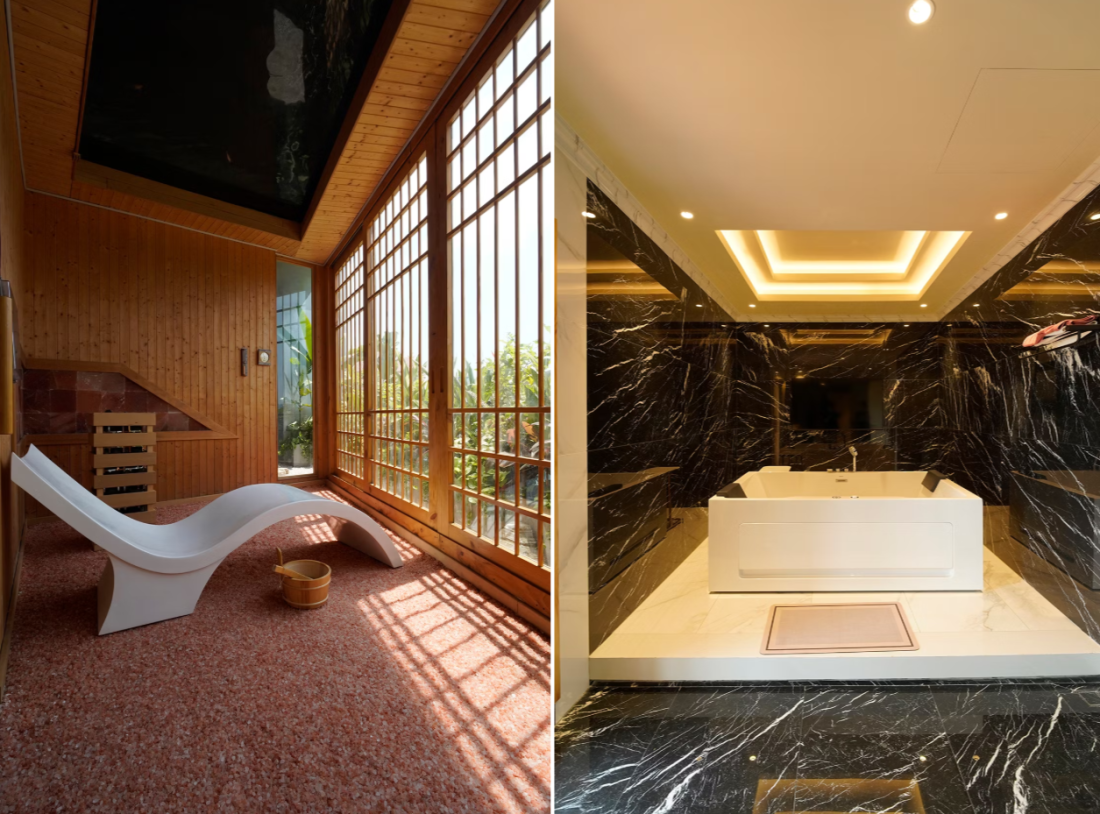 Một điểm nhấn thú vị là khu giải trí riêng tư. Phòng karaoke với tường cách âm dày dặn, ghế da êm ái và hệ thống âm thanh cao cấp. Bên cạnh là bar chill gần hồ bơi, với quầy bar bê tông và ghế ngồi ngoài trời.