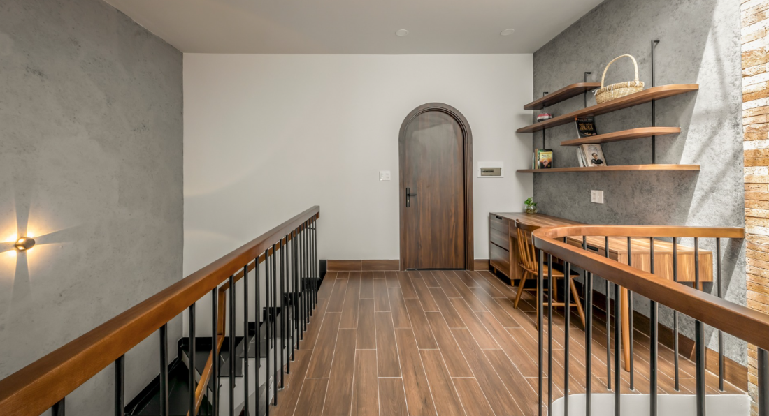 Hành lang chuyển tiếp đến phòng ngủ sẽ đi qua góc làm việc nhỏ gọn.