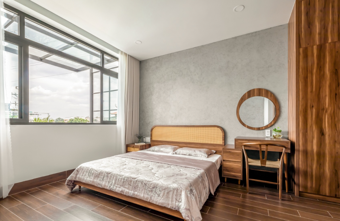Ngay cả bên trong phòng ngủ cũng đi theo tông màu và chất liệu chủ đạo của biệt thự mini.