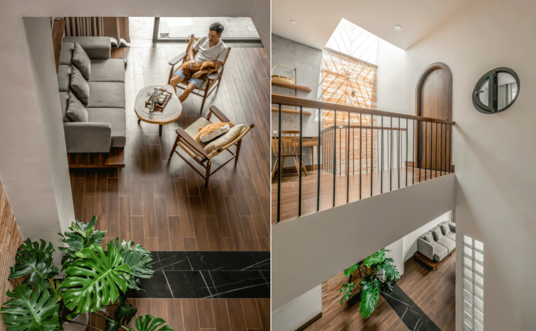Giếng trời, khoảng thông tầng không chỉ đáp ứng chức năng thông gió, ánh sáng mà còn mang lại nhiều cảm xúc kết nối giữa các thành viên trong gia đình.
