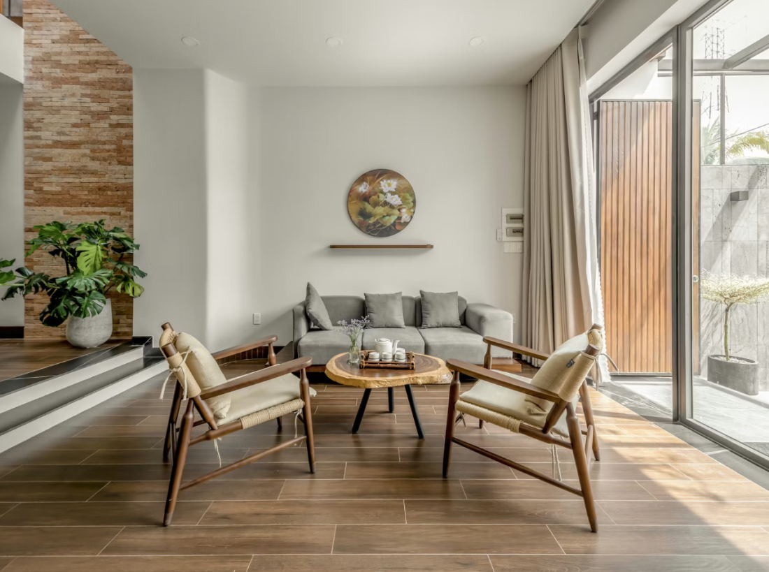 Một ngôi nhà sống chậm, và tận hưởng nhịp điệu của ánh sáng, gió trời. Khám phá cách kiến trúc sư tổ chức hai khối chữ nhật vuông góc để tạo ra sân trong bán kính xanh mát, và làm thế nào mái ngói đất nung truyền thống lại được diễn giải bằng hình thái hiện đại, tạo nên sự cân bằng hoàn hảo giữa truyền thống và sự tiện nghi.