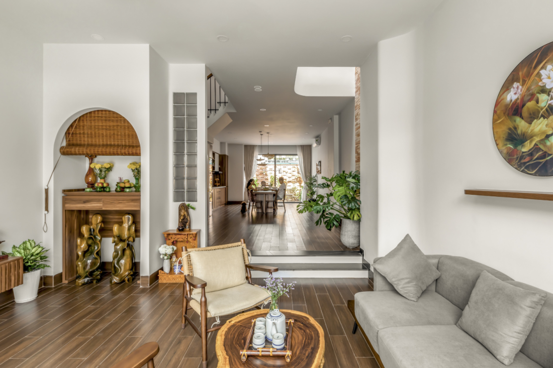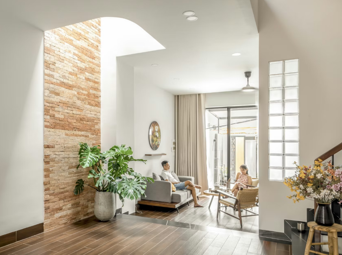 Điểm nhấn kiến trúc: Giếng trời và vườn sau, hai yếu tố này là chìa khóa để đưa thiên nhiên và ánh sáng vào sâu bên trong ngôi nhà. Giếng trời trung tâm: Điểm nhấn đặc biệt trong thiết kế là giếng trời được đặt ngay trung tâm ngôi nhà. Ánh sáng tự nhiên từ giếng trời lan tỏa đều khắp các không gian, giúp ngôi nhà luôn tràn ngập ánh sáng và được kết nối chặt chẽ với thiên nhiên bên ngoài.